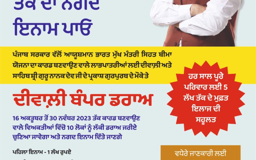 ਮੁੱਖ ਮੰਤਰੀ ਭਗਵੰਤ ਸਿੰਘ ਮਾਨ ਦੇ ਉਦੇਸ਼ ਅਨੁਸਾਰ ਪੰਜਾਬ ਦੇ ਵੱਧ ਤੋਂ ਵੱਧ ਲੋਕਾਂ ਨੂੰ ਸਿਹਤ ਬੀਮਾ ਕਵਰ ਹੇਠ ਰਜਿਸਟਰ ਕਰਨ ਲਈ ਪੰਜਾਬ ਰਾਜ ਸਿਹਤ ਏਜੰਸੀ ਨੇ ਪੰਜਾਬ ਦੇ ਸਿਹਤ ਤੇ ਪਰਿਵਾਰ ਭਲਾਈ ਮੰਤਰੀ ਡਾ. ਬਲਬੀਰ ਸਿੰਘ ਦੇ ਦਿਸ਼ਾ ਨਿਰਦੇਸ਼ਾਂ ‘ਤੇ ਦੀਵਾਲੀ ਬੰਪਰ ਡਰਾਅ ਕੱਢਿਆ ਹੈ ਜਿਸ ਤਹਿਤ ਜੇ ਕੋਈ ਵੀ ਵਿਅਕਤੀ 16 ਅਕਤੂਬਰ ਤੋਂ 30 ਨਵੰਬਰ, 2023 ਤੱਕ ਆਯੁਸ਼ਮਾਨ ਭਾਰਤ ਮੁੱਖ ਮੰਤਰੀ ਸਿਹਤ ਬੀਮਾ ਯੋਜਨਾ ਲਈ ਆਪਣੇ ਆਪ ਨੂੰ ਰਜਿਸਟਰ ਕਰਦਾ ਹੈ, ਉਸ ਕੋਲ ਇੱਕ ਲੱਖ ਰੁਪਏ ਤੱਕ ਦਾ ਇਨਾਮ ਜਿੱਤਣ ਦਾ ਮੌਕਾ ਹੋਵੇਗਾ।
