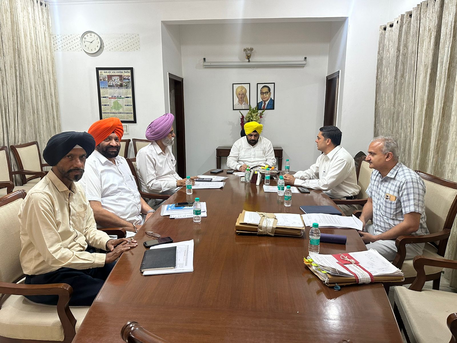 ਬਿਜਲੀ ਮੰਤਰੀ ਹਰਭਜਨ ਸਿੰਘ ਈ.ਟੀ.ਓ ਵੱਲੋਂ ਝੋਨੇ ਦੇ ਚੱਲ ਰਹੇ ਸੀਜ਼ਨ ਲਈ ਸੂਬੇ ਦੇ ਬਿਜਲੀ ਸਪਲਾਈ ਦੇ ਪ੍ਰਬੰਧਾਂ ਦਾ ਜਾਇਜ਼ਾ ਲੈਣ ਲਈ ਵਧੀਕ ਮੁੱਖ ਸਕੱਤਰ ਬਿਜਲੀ ਸ੍ਰੀ ਤਜਵੀਰ ਸਿੰਘ, ਸੀ.ਐਮ.ਡੀ./ਪੀ.ਐਸ.ਪੀ.ਸੀ.ਐਲ. ਇੰਜ. ਬਲਦੇਵ ਸਿੰਘ ਸਰਾਂ, ਡਾਇਰੈਕਟਰ ਡਿਸਟਰੀਬਿਊਸ਼ਨ, ਪੀ.ਐਸ.ਪੀ.ਸੀ.ਐਲ., ਇੰਜ. ਡੀ.ਪੀ.ਐਸ. ਗਰੇਵਾਲ, ਅਤੇ ਡਾਇਰੈਕਟਰ ਜਨਰੇਸ਼ਨ, ਪੀ.ਐਸ.ਪੀ.ਸੀ.ਐਲ, ਇੰਜ. ਪਰਮਜੀਤ ਸਿੰਘ ਨਾਲ ਮੀਟਿੰਗ ਕੀਤੀ ਗਈ।