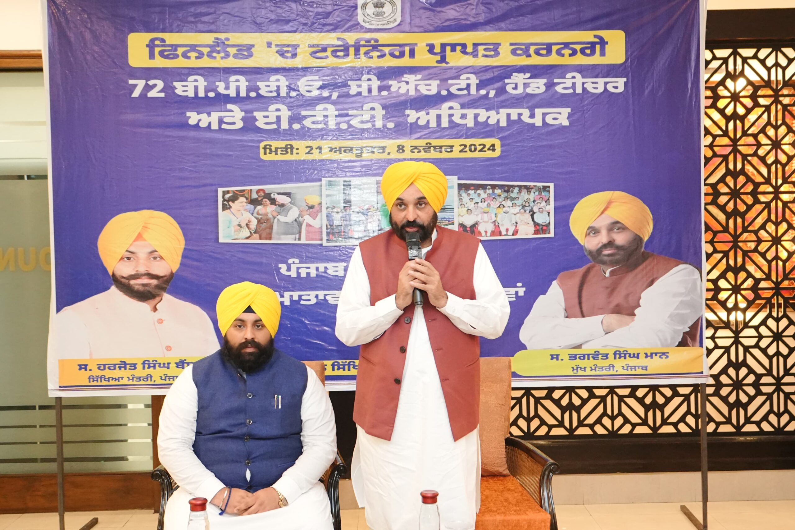 ਫਿਨਲੈਂਡ ਵਿੱਚ ਸਿਖਲਾਈ ਲਈ ਜਾਣ ਵਾਲੇ ਅਧਿਆਪਕਾਂ ਦੇ ਪਹਿਲੇ ਬੈਚ ਨੂੰ ਰਵਾਨਾ ਕਰਦਿਆਂ ਇਕੱਠ ਨੂੰ ਸੰਬੋਧਨ ਕਰਦਿਆਂ ਮੁੱਖ ਮੰਤਰੀ ਨੇ ਕਿਹਾ ਕਿ ਅੱਜ ਦਾ ਦਿਨ ਪੰਜਾਬ ਦੇ ਸਿੱਖਿਆ ਢਾਂਚੇ ਵਿੱਚ ਇਕ ਅਹਿਮ ਮੀਲ ਪੱਥਰ ਹੈ ਕਿਉਂਕਿ ਅੱਜ ਅਸੀਂ ਇੱਥੇ ਆਪਣੇ 72 ਪ੍ਰਾਇਮਰੀ ਅਧਿਆਪਕਾਂ ਨੂੰ ਪੇਸ਼ੇਵਰ ਸਿੱਖਿਆ ਲਈ ਫਿਨਲੈਂਡ ਦੇ ਸਫ਼ਰ ਵਾਸਤੇ ਰਵਾਨਾ ਕਰਨ ਆਏ ਹਾਂ। ਉਨ੍ਹਾਂ ਕਿਹਾ ਕਿ ਇਹ ਮਹਿਜ਼ ਨਵੇਂ ਮੁਲਕ ਦਾ ਸਫ਼ਰ ਹੀ ਨਹੀਂ ਹੈ, ਸਗੋਂ ਪੰਜਾਬ ਵਿੱਚ ਸਿੱਖਿਆ ਦੇ ਭਵਿੱਖੀ ਨਕਸ਼ ਘੜਨ ਦੀ ਦਿਸ਼ਾ ਵਿੱਚ ਨਵੀਆਂ ਅਧਿਆਪਨ ਤਕਨੀਕਾਂ, ਬਿਹਤਰੀਨ ਰਵਾਇਤਾਂ ਅਤੇ ਨਵੇਂ ਤਰੀਕਿਆਂ ਬਾਰੇ ਸਮਝਣ ਦਾ ਮੌਕਾ ਹੈ। ਭਗਵੰਤ ਸਿੰਘ ਮਾਨ ਨੇ ਕਿਹਾ ਕਿ ਸਿੱਖਿਆ ਕਿਸੇ ਵੀ ਸਮਾਜ ਦੀ ਰੀੜ੍ਹ ਦੀ ਹੱਡੀ ਹੁੰਦੀ ਹੈ ਅਤੇ ਪੰਜਾਬ ਵਿੱਚ ਸੂਬਾ ਸਰਕਾਰ ਸਿੱਖਿਆ ਢਾਂਚੇ ਨੂੰ ਸੁਧਾਰਨ ਲਈ ਲਗਾਤਾਰ ਹੰਭਲੇ ਮਾਰ ਰਹੀ ਹੈ ਤਾਂ ਕਿ ਹਰੇਕ ਬੱਚੇ ਦੀ ਬਿਨਾਂ ਕਿਸੇ ਪੱਖਪਾਤ ਤੋਂ ਉੱਚ ਮਿਆਰੀ ਸਿੱਖਿਆ ਤੱਕ ਪਹੁੰਚ ਯਕੀਨੀ ਬਣੇ।