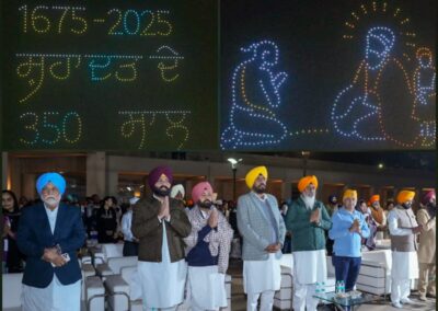 ਨੌਵੇਂ ਸਿੱਖ ਗੁਰੂ ਸਾਹਿਬ ਅਤੇ ‘ਹਿੰਦ ਦੀ ਚਾਦਰ’ ਸ੍ਰੀ ਗੁਰੂ ਤੇਗ਼ ਬਹਾਦਰ ਜੀ ਦੇ 350ਵੇਂ ਸ਼ਹੀਦੀ ਦਿਹਾੜੇ ਨੂੰ ਸਮਰਪਿਤ ਸਮਾਗਮਾਂ ਦੇ ਹਿੱਸੇ ਵਜੋਂ ਮੁੱਖ ਮੰਤਰੀ ਭਗਵੰਤ ਸਿੰਘ ਮਾਨ ਦੀ ਅਗਵਾਈ ਵਾਲੀ ਪੰਜਾਬ ਸਰਕਾਰ ਵੱਲੋਂ ਕਰਵਾਏ ਪ੍ਰਭਾਵਸ਼ਾਲੀ ਡਰੋਨ ਸ਼ੋਅ ਨਾਲ ਪਵਿੱਤਰ ਨਗਰੀ ਸ੍ਰੀ ਅਨੰਦਪੁਰ ਸਾਹਿਬ ਦਾ ਅਸਮਾਨ ਰੁਸ਼ਨਾ ਉੱਠਿਆ।