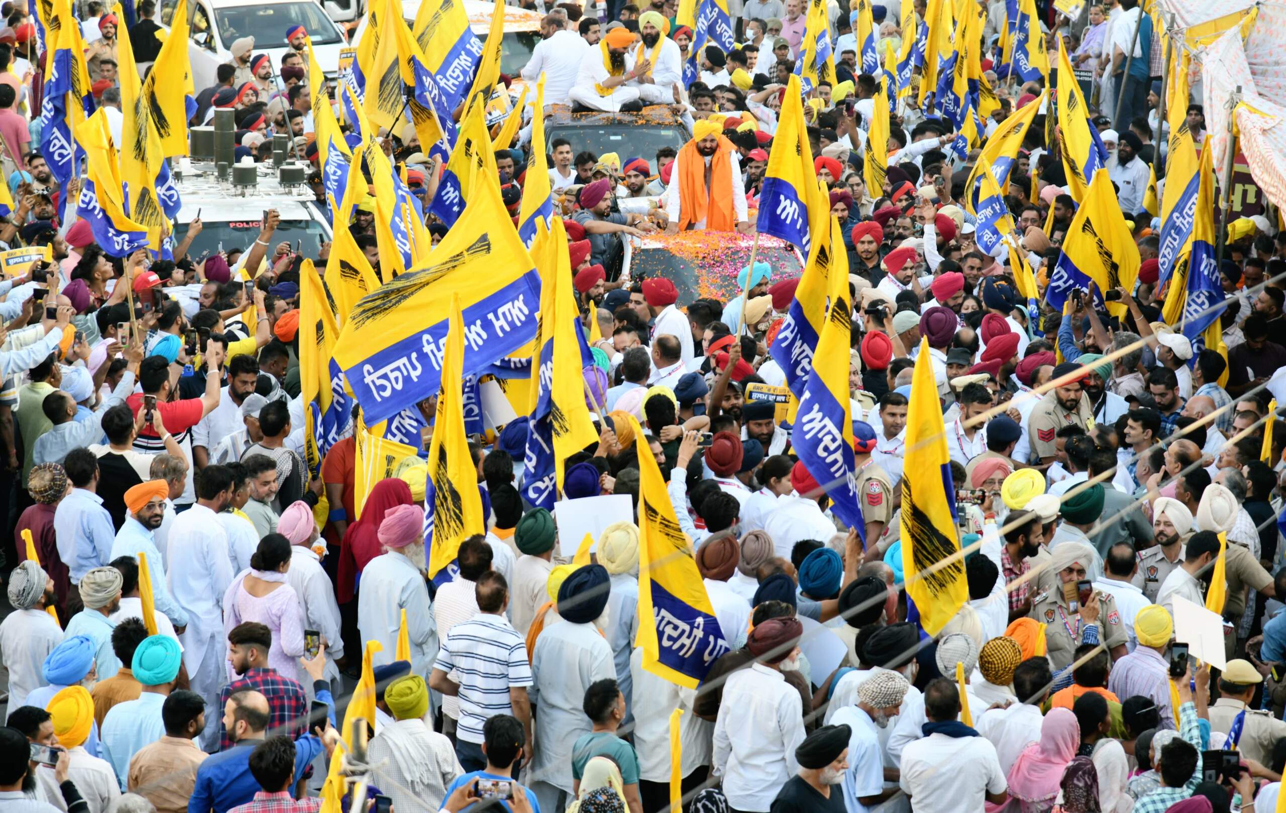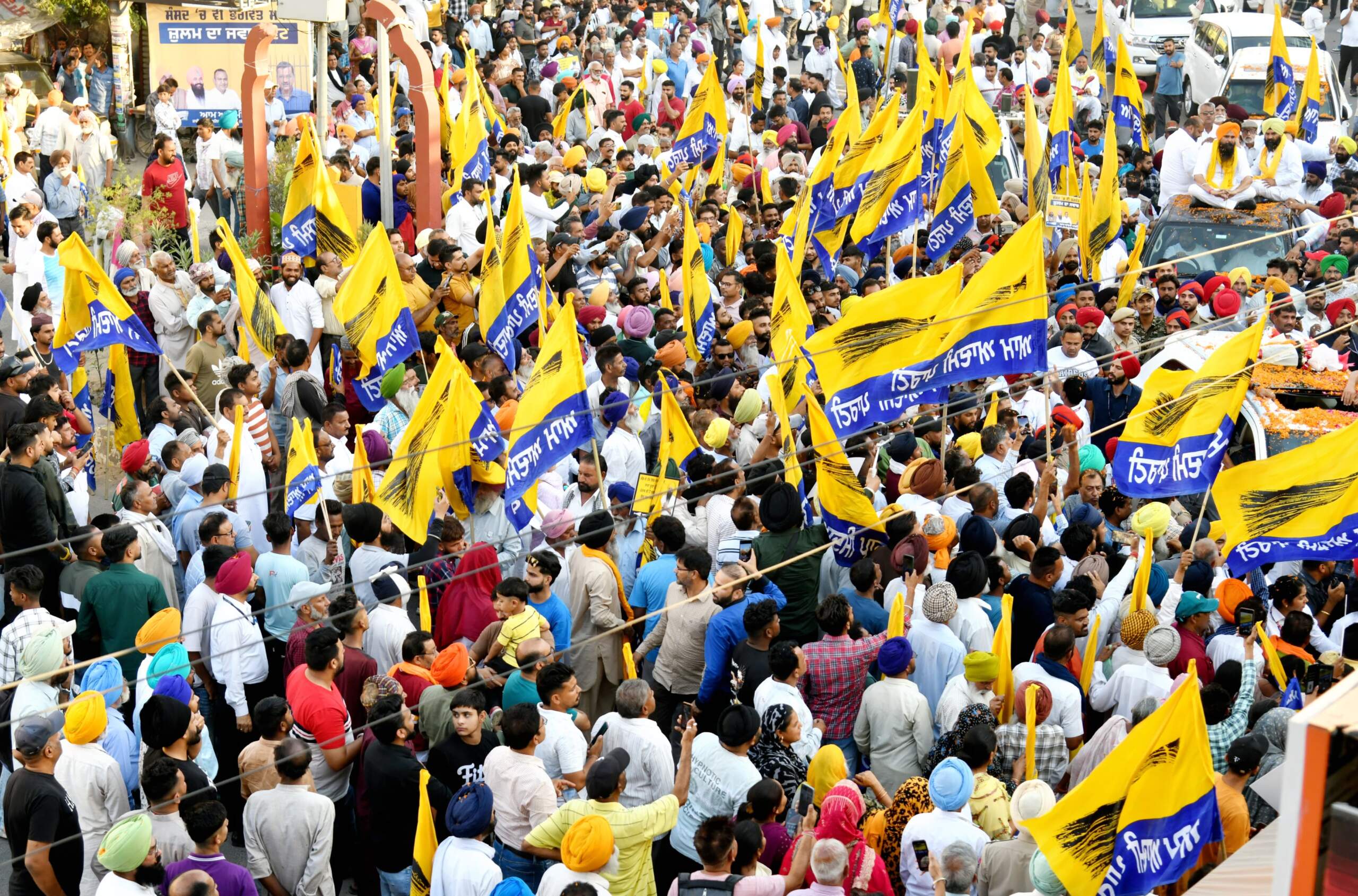 ਮੁੱਖ ਮੰਤਰੀ ਭਗਵੰਤ ਮਾਨ ਨੇ ਸੋਮਵਾਰ ਨੂੰ ਨਵਾਂਸ਼ਹਿਰ ‘ਚ ਅਨੰਦਪੁਰ ਸਾਹਿਬ ਤੋਂ ਲੋਕ ਸਭਾ ਉਮੀਦਵਾਰ ਮਲਵਿੰਦਰ ਸਿੰਘ ਕੰਗ ਲਈ ਚੋਣ ਪ੍ਰਚਾਰ ਕੀਤਾ। ਸੀਐਮ ਭਗਵੰਤ ਮਾਨ ਨੇ ‘ਆਪ’ ਉਮੀਦਵਾਰ ਮਲਵਿੰਦਰ ਸਿੰਘ ਕੰਗ,ਡਿਪਟੀ ਸਪੀਕਰ ਜੈ ਕ੍ਰਿਸ਼ਨ ਸਿੰਘ ਰੋੜੀ ਅਤੇ ‘ਆਪ’ ਵਿਧਾਇਕ ਦਿਨੇਸ਼ ਚੱਢਾ ਦੇ ਨਾਲ ਨਵਾਂਸ਼ਹਿਰ ‘ਚ ਵਿਸ਼ਾਲ ਰੋਡ ਸ਼ੋਅ ਕੱਢਿਆ ਅਤੇ ਵੋਟਰਾਂ ਨੂੰ ਤਾਨਾਸ਼ਾਹੀ ਖ਼ਿਲਾਫ਼ ਵੋਟ ਪਾਉਣ ਦੀ ਅਪੀਲ ਕੀਤੀ।