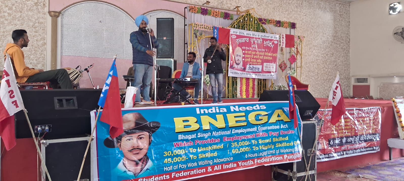ਫਾਜ਼ਿਲਕਾ 26 ਦਸੰਬਰ ( ) ਅੱਜ ਇਥੇ ਸਥਾਨਕ ਔਰਬਿਟ ਪੈਲੇਸ ਵਿਖੇ ਸਰਬ ਭਾਰਤ ਨੌਜਵਾਨ ਸਭਾ ਅਤੇ ਆਲ ਇੰਡੀਆ ਸਟੂਡੈਂਟਸ ਫੈਡਰੇਸ਼ਨ ਵੱਲੋਂ ਰੁਜ਼ਗਾਰ ਪ੍ਰਾਪਤੀ ਮੁਹਿੰਮ ਦੇ ਬੈਨਰ ਹੇਠ ਸ਼ਹੀਦ ਊਧਮ ਸਿੰਘ ਸੁਨਾਮ ਦੇ ਜਨਮ ਦਿਹਾੜੇ ਮੌਕੇ ਰੁਜ਼ਗਾਰ ਪ੍ਰਾਪਤੀ ਲਈ ਬਨੇਗਾ ਲਈ ਸੰਘਰਸ਼, ਹਰ ਇਕ ਲਈ ਮੁਫ਼ਤ ਇਲਾਜ ਅਤੇ ਸਿੱਖਿਆ ਅਤੇ ਪੁਰਾਣੀ ਪੈਨਸ਼ਨ ਸਕੀਮ ਦੀ ਬਹਾਲੀ ਵਿਸ਼ਿਆਂ ਤੇ ਸੈਮੀਨਰ ਅਤੇ ਇਨਕਲਾਬੀ ਸਭਿਆਚਾਰਕ ਸਮਾਗਮ ਕਰਵਾਇਆ ਗਿਆ। ਜਿਸ ਦੀ ਅਗਵਾਈ ਸਰਬ ਭਾਰਤ ਨੌਜਵਾਨ ਸਭਾ ਦੇ ਸੂਬਾ ਪ੍ਰਧਾਨ ਪਰਮਜੀਤ ਸਿੰਘ ਢਾਬਾਂ,ਜਿਲ੍ਹਾ ਪ੍ਰਧਾਨ ਹਰਭਜਨ ਛਪੜੀ ਵਾਲਾ, ਆਲ ਇੰਡੀਆ ਸਟੂਡੈਂਟਸ ਫੈਡਰੇਸ਼ਨ ਦੇ ਸੂਬਾ ਪ੍ਰਧਾਨ ਰਮਨ ਧਰਮੂ ਵਾਲਾ ਨੇ ਕੀਤੀ।