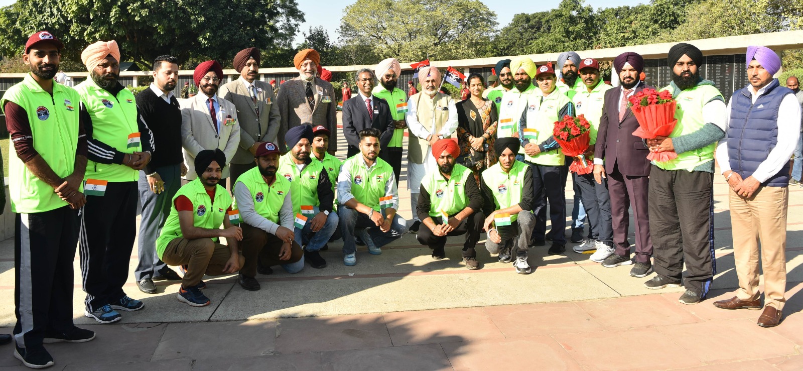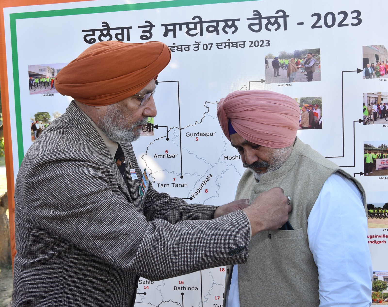 ਪੰਜਾਬ ਭਰ ‘ਚ ਸ਼ਹੀਦ ਸੈਨਿਕਾਂ ਦੀਆਂ ਸ਼ਹਾਦਤਾਂ ਬਾਰੇ ਲੋਕਾਂ ਨੂੰ ਜਾਗਰੂਕ ਕਰਨ ਅਤੇ ਨੌਜਵਾਨਾਂ ਨੂੰ ਹਥਿਆਰਬੰਦ ਸੈਨਾਵਾਂ ਵਿੱਚ ਭਰਤੀ ਹੋਣ ਲਈ ਉਤਸ਼ਾਹਿਤ ਕਰਨ ਵਾਸਤੇ ਉਲੀਕੀ ਗਈ ਦੇਸ਼ ਵਿੱਚ ਆਪਣੇ ਕਿਸਮ ਦੀ ਪਹਿਲੀ ਸਾਈਕਲ ਰੈਲੀ ਨੂੰ ਅੱਜ ਆਰਮਡ ਫੋਰਸਿਜ਼ ਫਲੈਗ ਦਿਵਸ ਮੌਕੇ ਰੱਖਿਆ ਸੇਵਾਵਾਂ ਭਲਾਈ ਮੰਤਰੀ ਸ. ਚੇਤਨ ਸਿੰਘ ਜੌੜਾਮਾਜਰਾ ਵੱਲੋਂ ਵਾਰ ਮੈਮੋਰੀਅਲ, ਬੋਗਨਵਿਲੀਆ ਪਾਰਕ, ਸੈਕਟਰ-3 ਵਿਖੇ ਸਮਾਪਤੀ ਸਮਾਰੋਹ ਦੌਰਾਨ ਫ਼ਲੈਗ-ਇਨ ਕੀਤਾ ਗਿਆ।